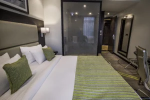 The room is equipped with a writing desk, a flat screen TV, temperature control system.
